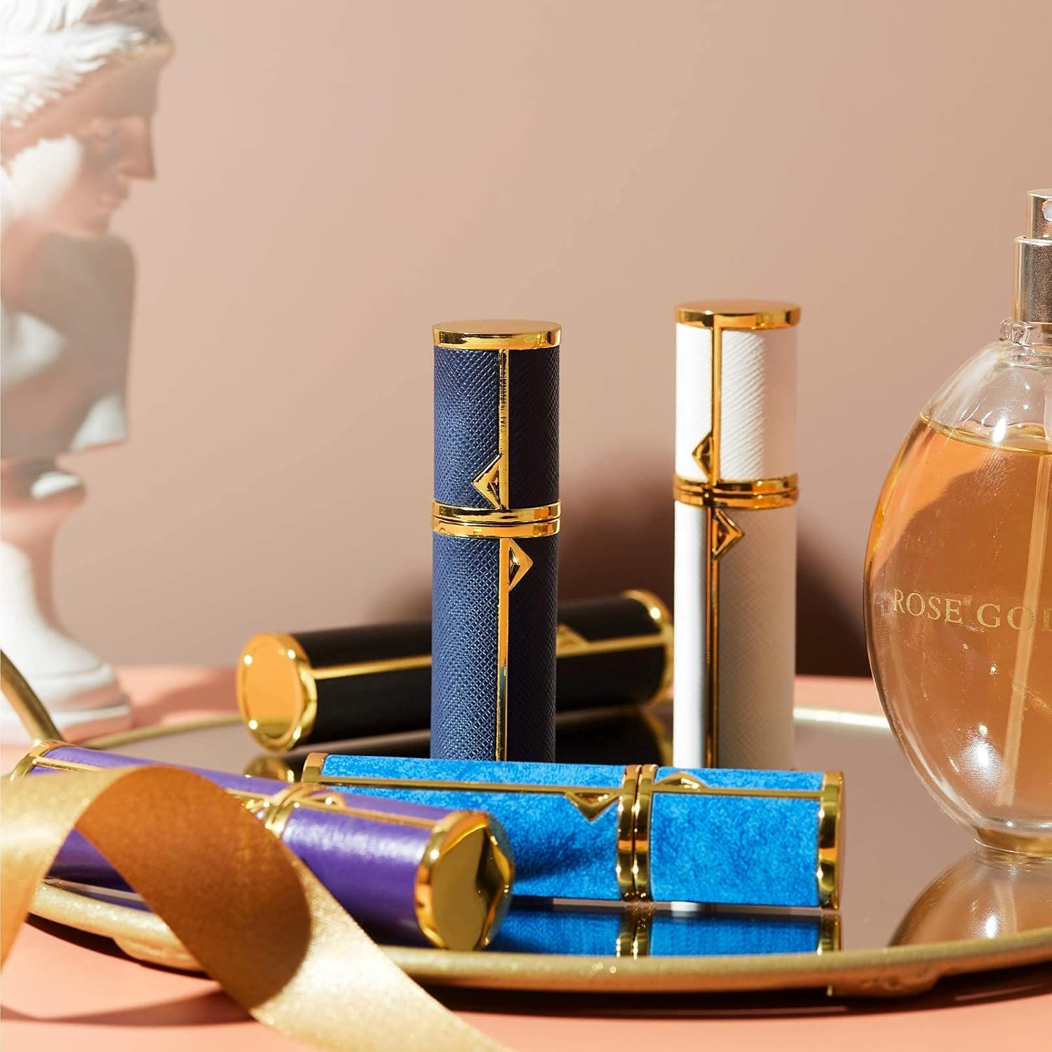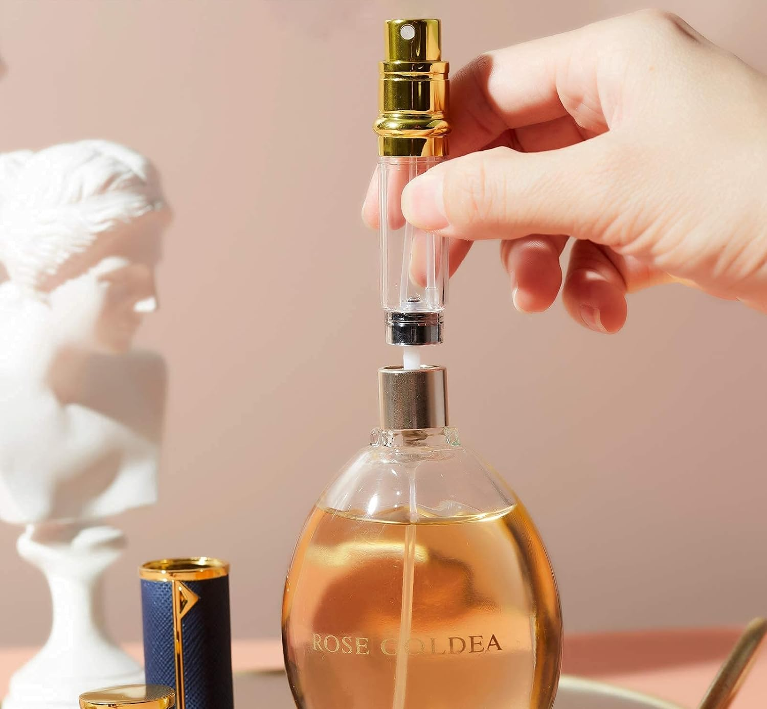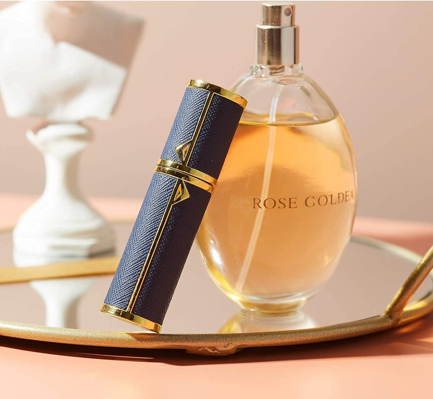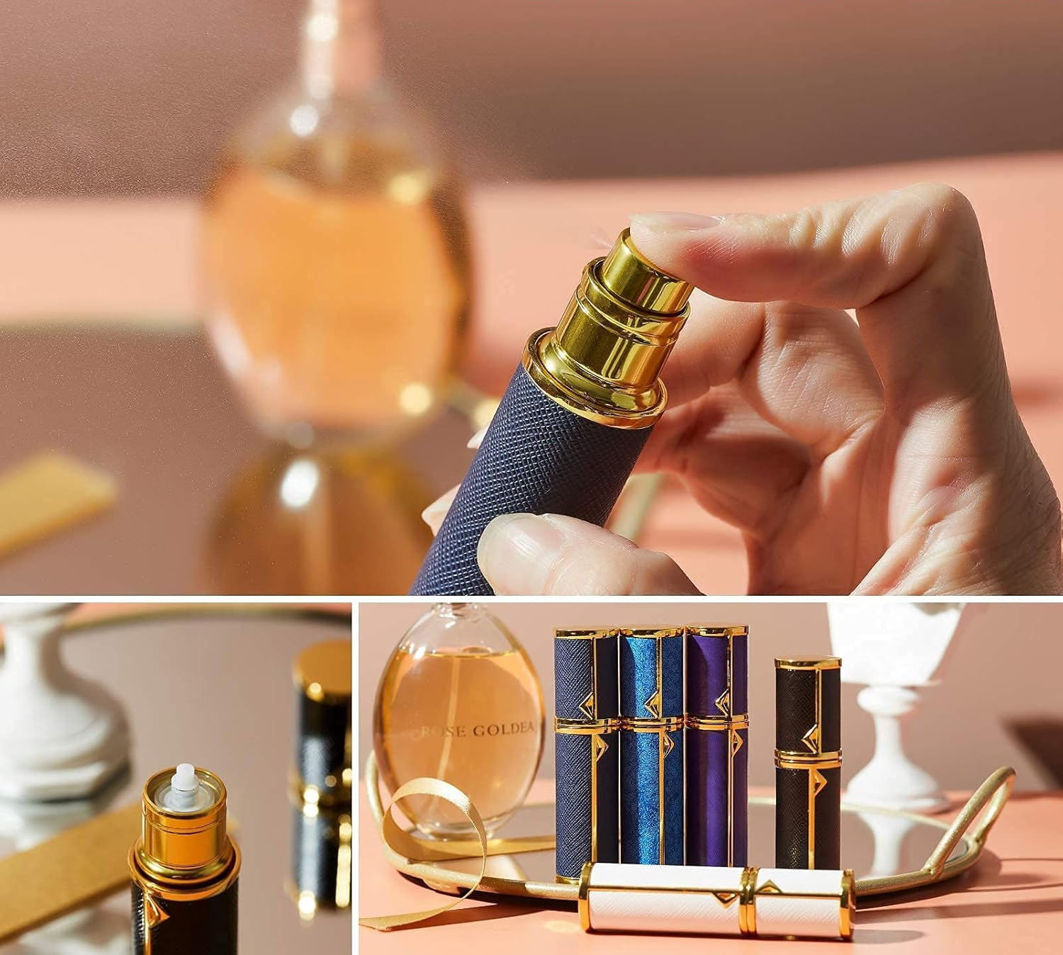 Le mini atomiseur se remplit facilement en retirant le capuchon et en insérant l’embout du flacon de parfum dans le réservoir. Il suffit de presser pour transférer le parfum.